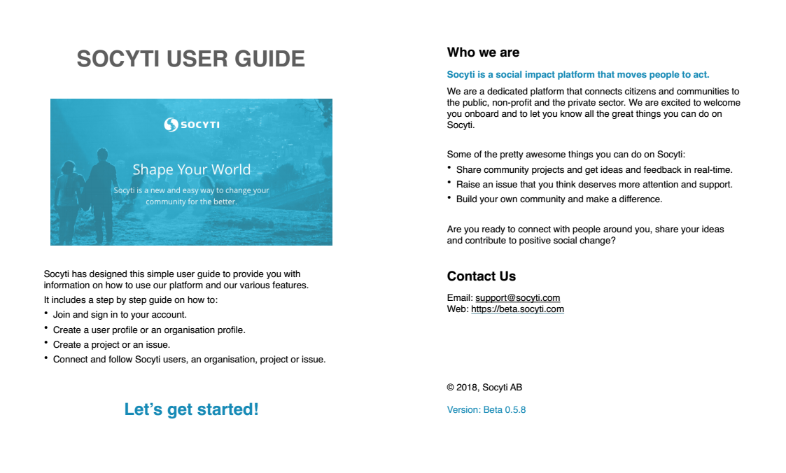 Welcome to Socyti! The social impact platform that moves people to act. We connect citizens and communities to the public, non-profit and the private sector. We advise you to read this User Agreement (the “Agreement”), as it explains the terms that apply to your use of Socyti.